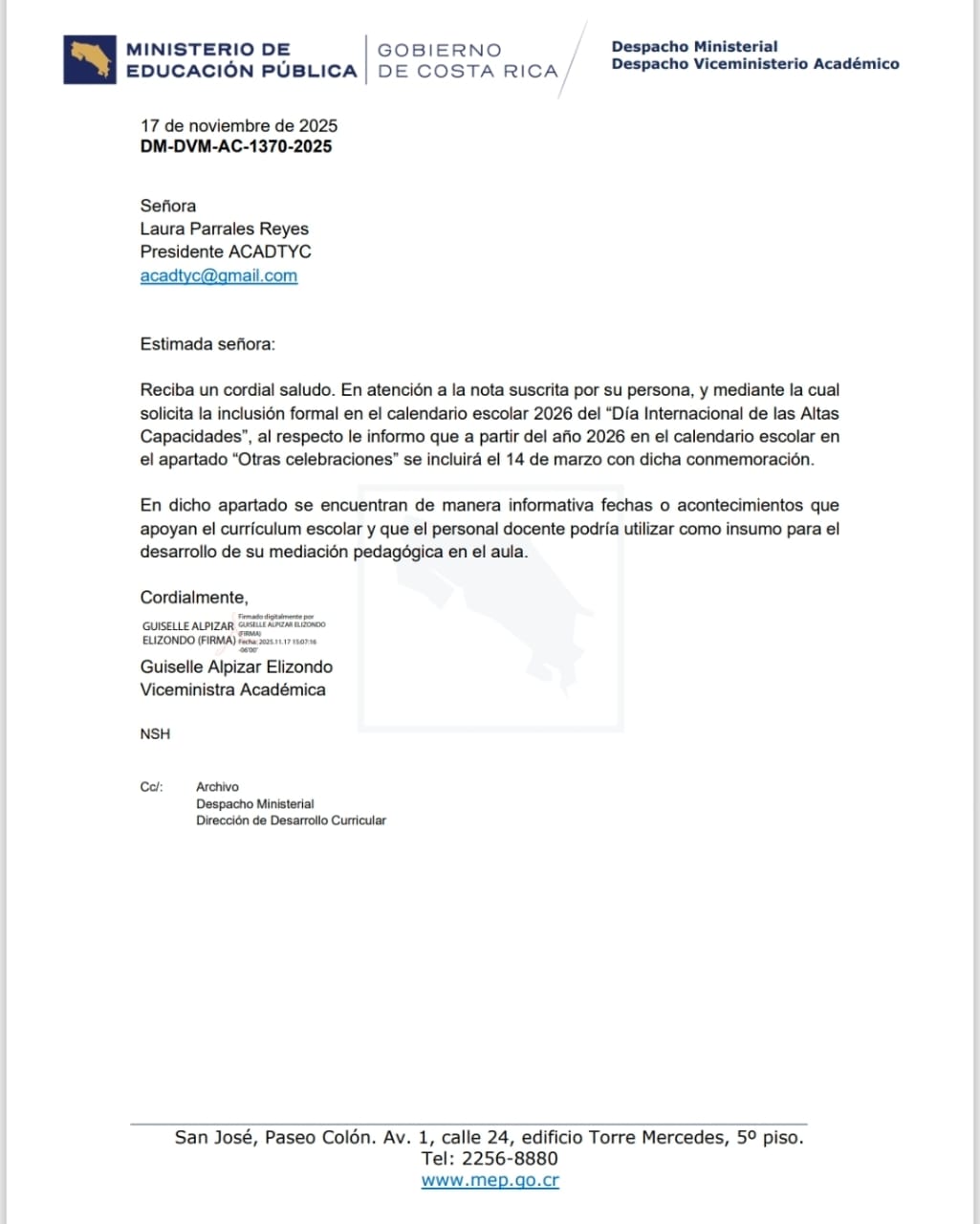 Queremos compartir con muchísimo orgullo y emoción que recibimos una comunicación oficial del Ministerio de Educación Pública donde se confirma que, a partir del 2026, el 14 de marzo – Día Internacional de las Altas Capacidades será incluido de manera formal en el calendario escolar de Costa Rica. 🇨🇷💛 Este logro significa un paso enorme para la visibilización, el reconocimiento y el apoyo a nuestros niños, niñas y jóvenes con alto potencial, así como para todas las familias y docentes que los acompañan día a día. Este avance no solo representa una fecha en el calendario; representa años de lucha, de tocar puertas, de explicar, sensibilizar, educar… y sobre todo, de creer profundamente en el derecho que tienen estos chicos de ser vistos, entendidos y acompañados. 🌱✨
